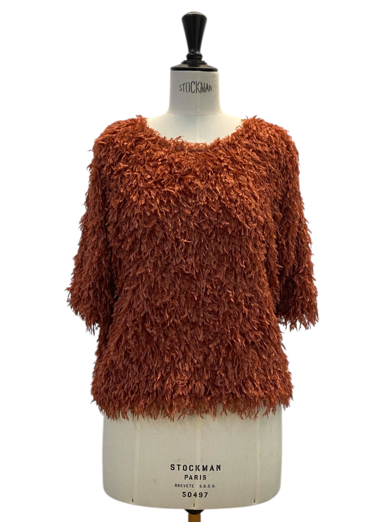 A short-sleeve top featuring a feather-like texture and a classic round neckline. Perfect for layering over a fitted top or wearing on its own, this versatile piece can be styled throughout the year.