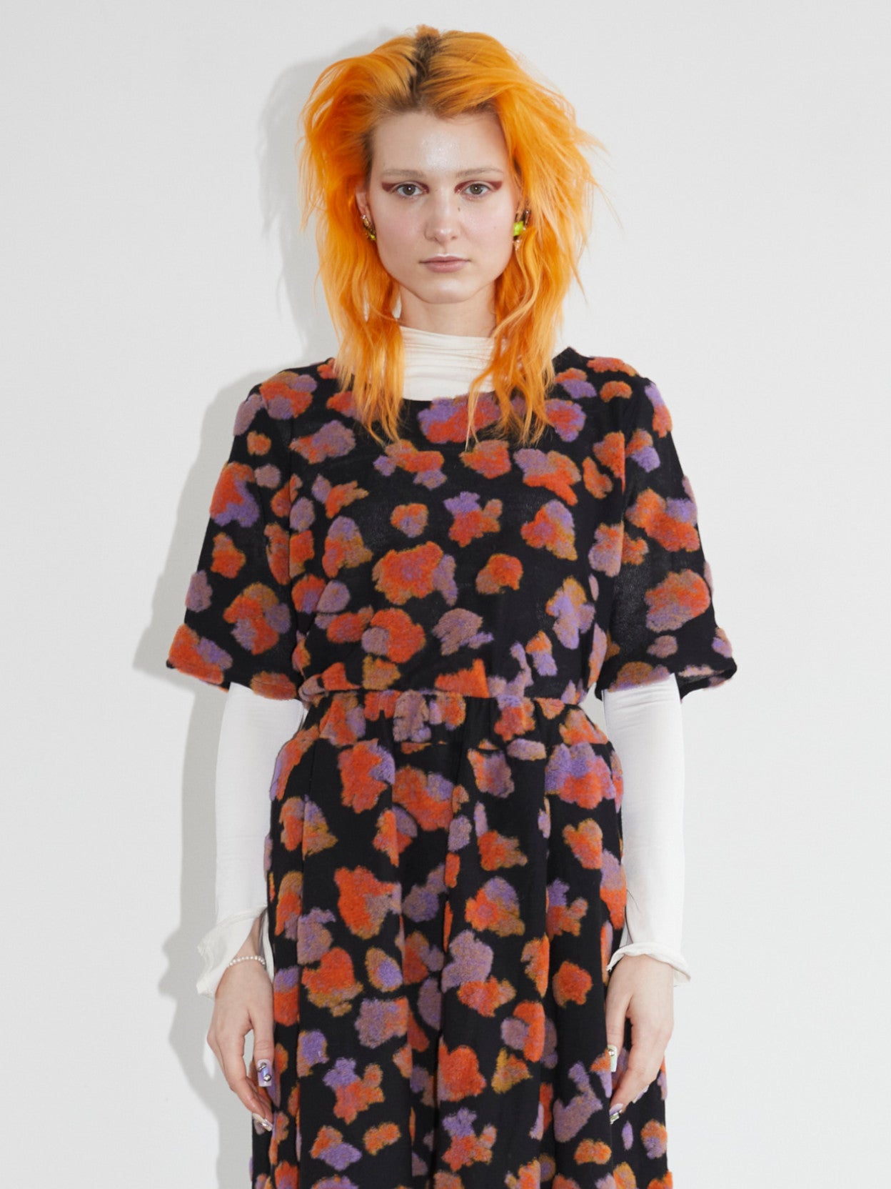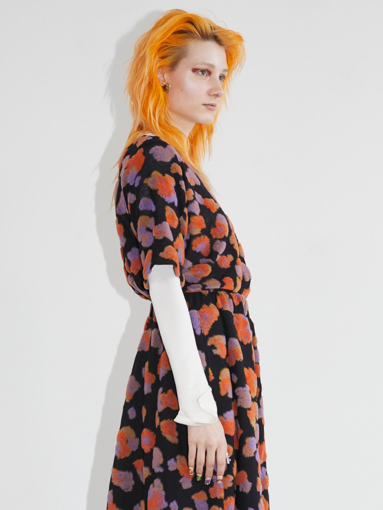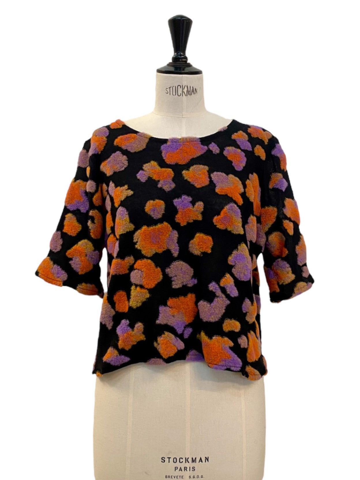 A blend of wool and cotton featuring a unique cloud-like pattern with orange and purple tufts. Crafted from an original design by FRANZIUS.