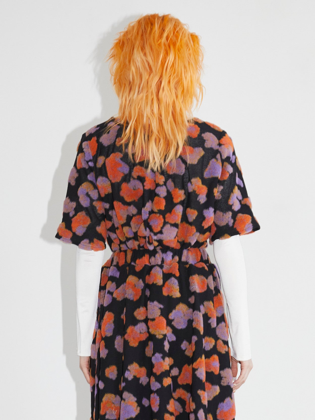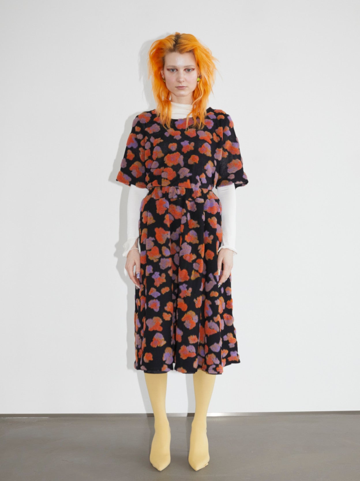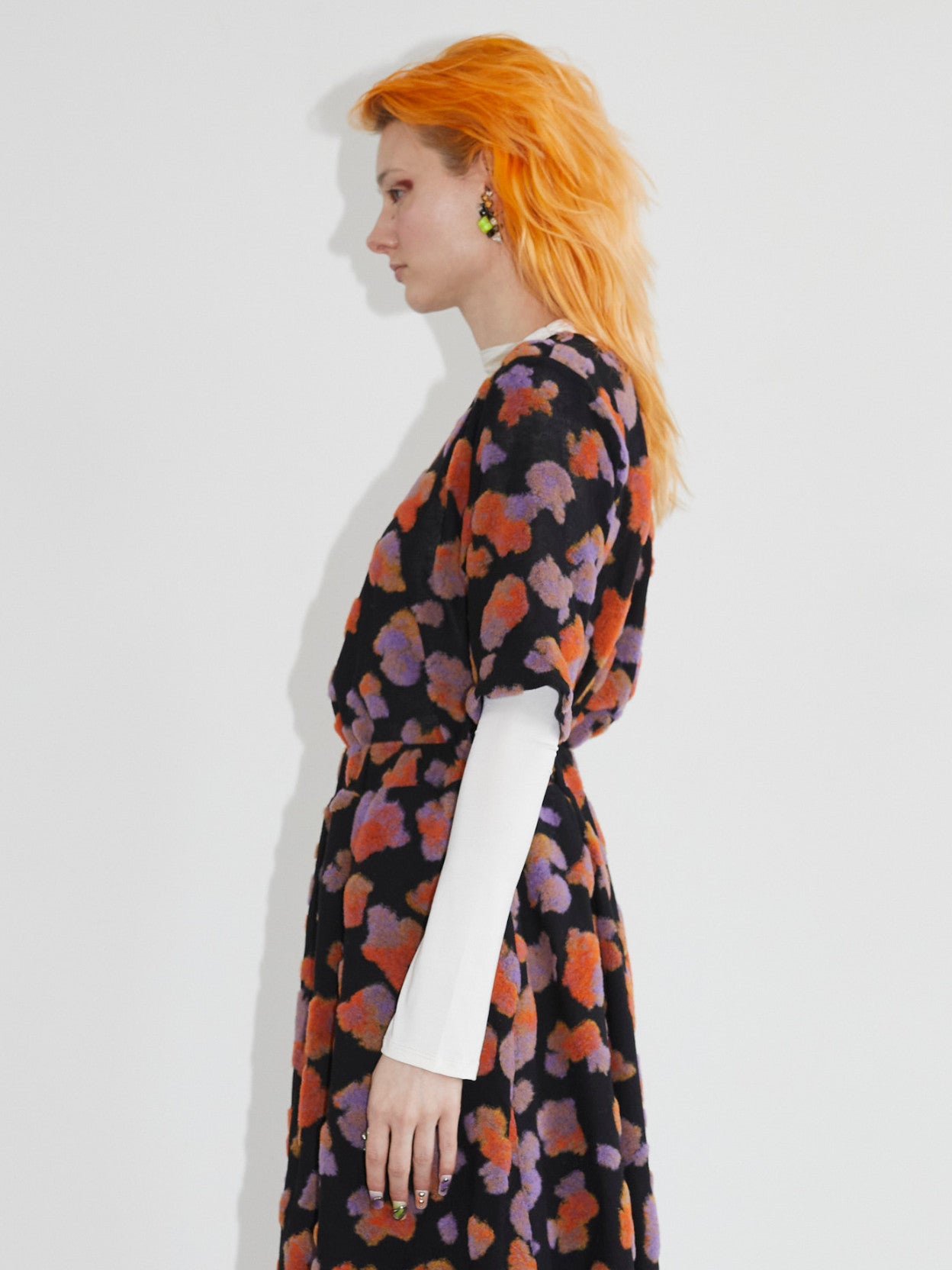 A blend of wool and cotton featuring a unique cloud-like pattern with orange and purple tufts. Crafted from an original design by FRANZIUS.