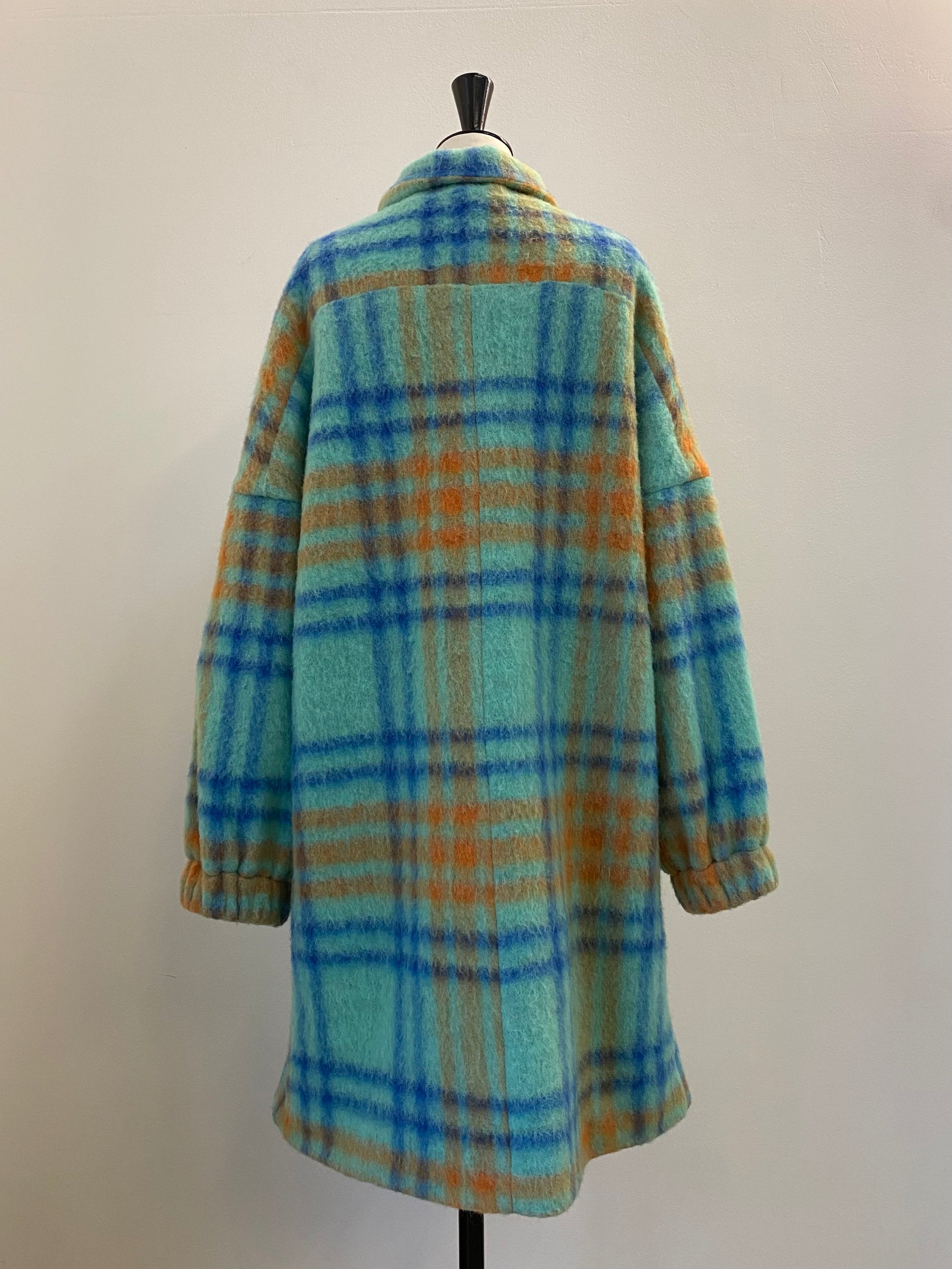Premium wool-blend hunter coat in a mohair texture and a check pattern. Designed with practical top entry patch pockets, a versatile zip-and-metal-button front that can be fully closed for warmth or left open to reveal the structured collar. Fully lined for comfort and ease of movement, this coat combines functionality with modern tailoring for everyday wear.