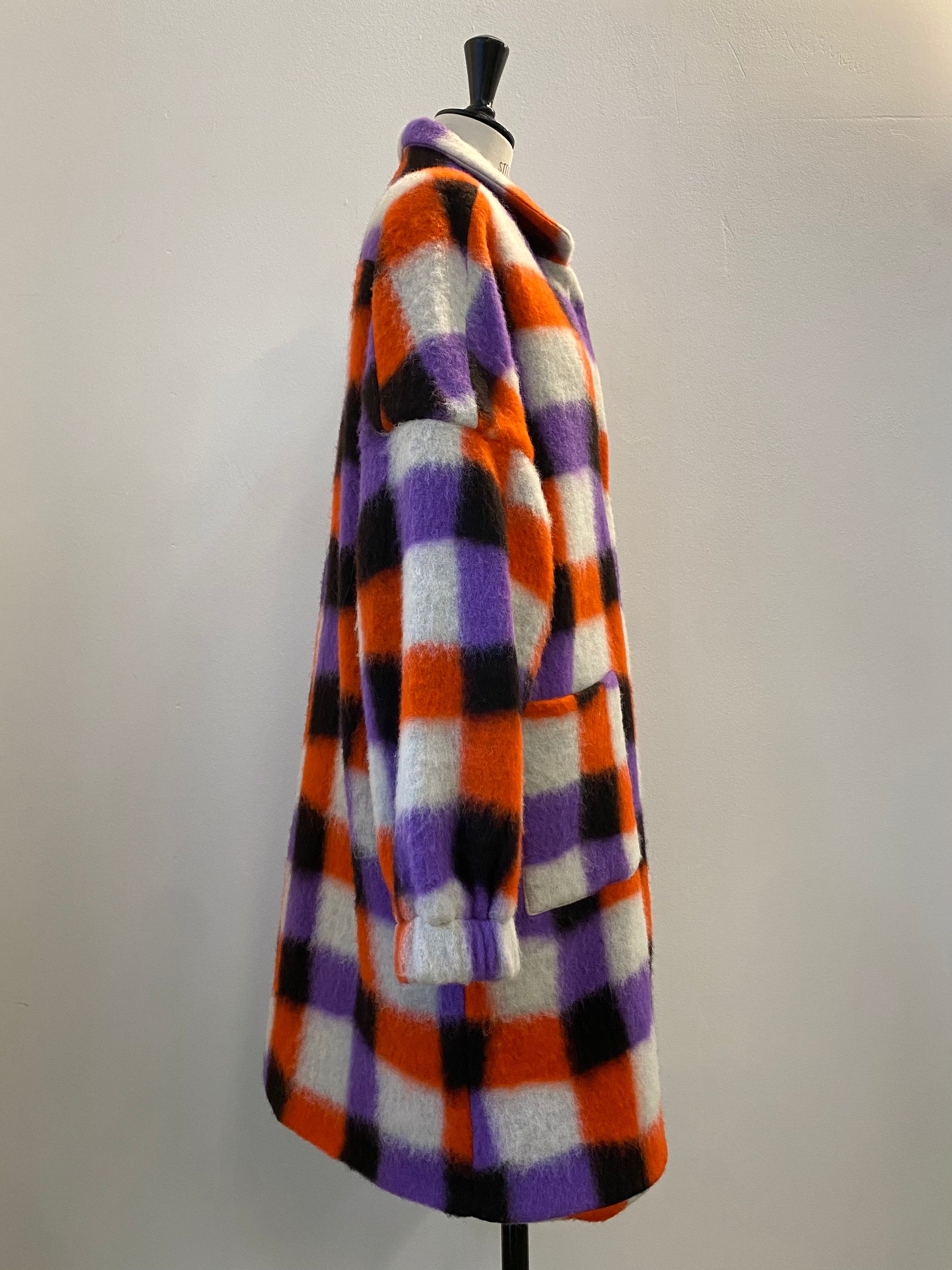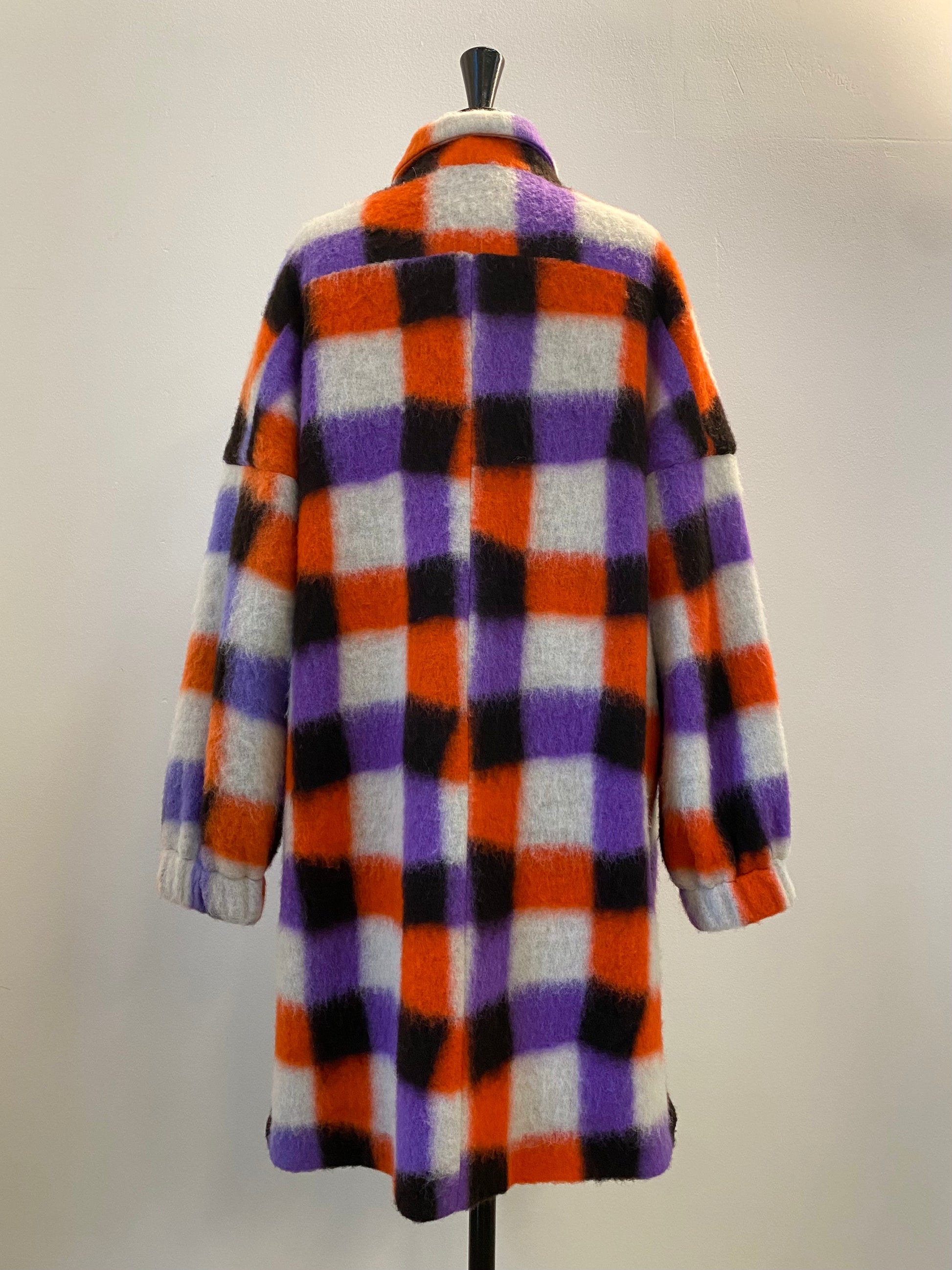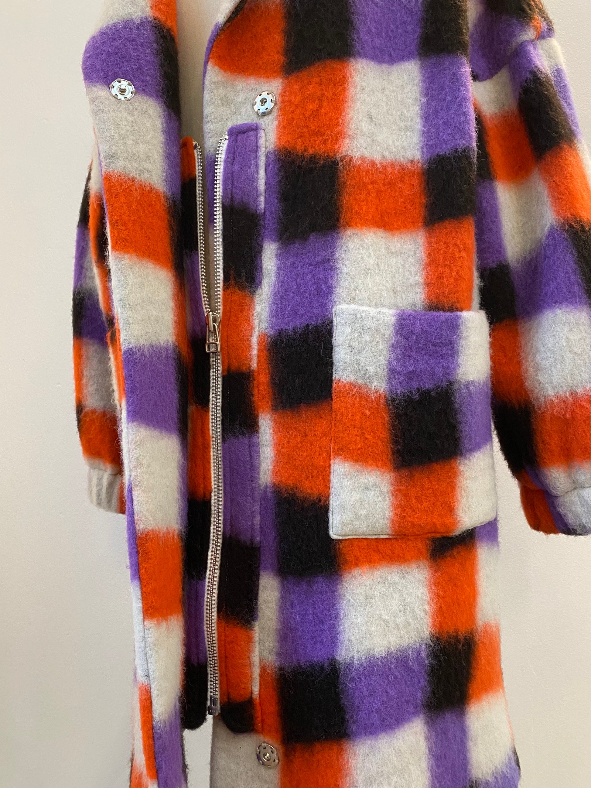 Premium wool-blend hunter coat in a mohair texture and a check pattern. Designed with practical top entry patch pockets, a versatile zip-and-metal-button front that can be fully closed for warmth or left open to reveal the structured collar. Fully lined for comfort and ease of movement, this coat combines functionality with modern tailoring for everyday wear.