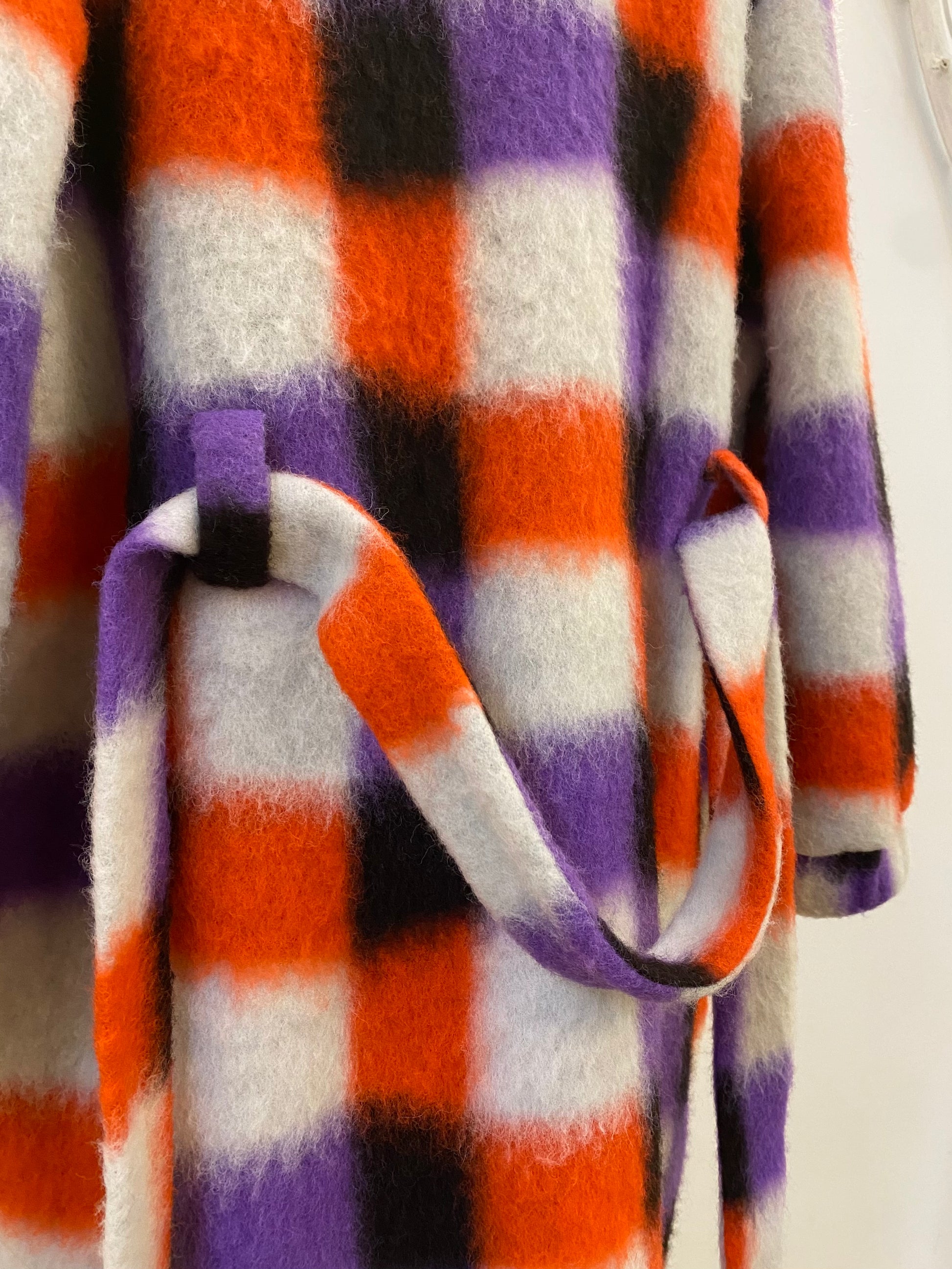Premium wool-blend towel coat in a mohair texture and a check pattern. Features a relaxed wrap-style collar, a double-breasted front with four buttons, and an adjustable rope belt for a cozy, comfy bathrobe-inspired fit. Fully lined and completed with practical patch pockets with a side entry for everyday wear.